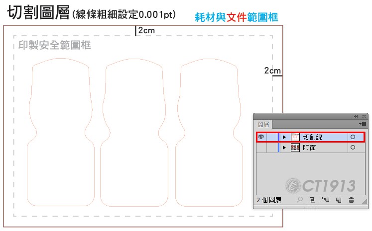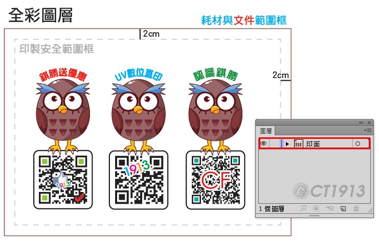 1. 開啟新文件(色彩模式CMYK 300DPI),設定印面框線並預留四邊2公分透明部分。 將圖層重新命名為「印面」後,拷貝(複製)此圖層。