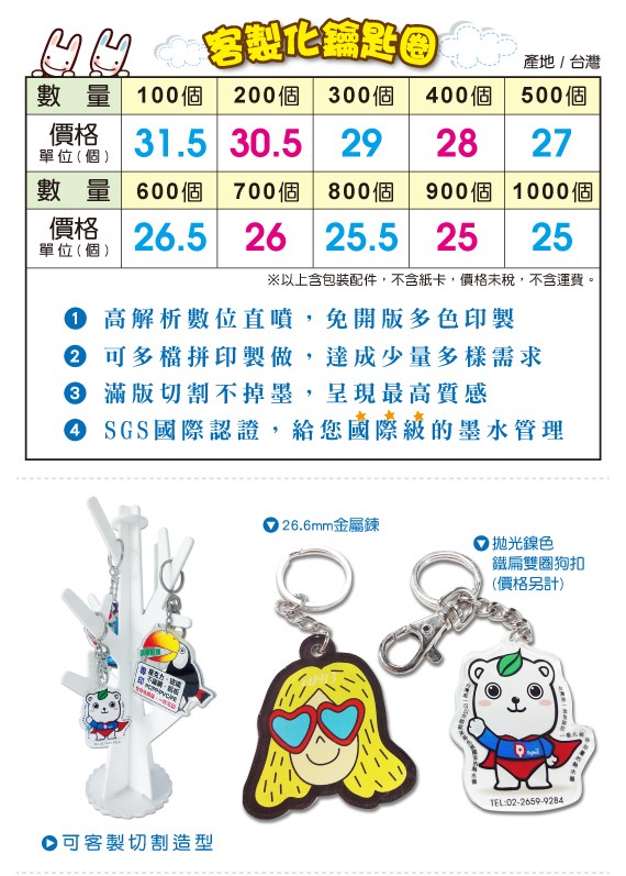 個別包裝:每個鑰匙圈入一自黏袋。如要紙卡價格另計,可客製印製全彩圖樣(限同圖檔)。